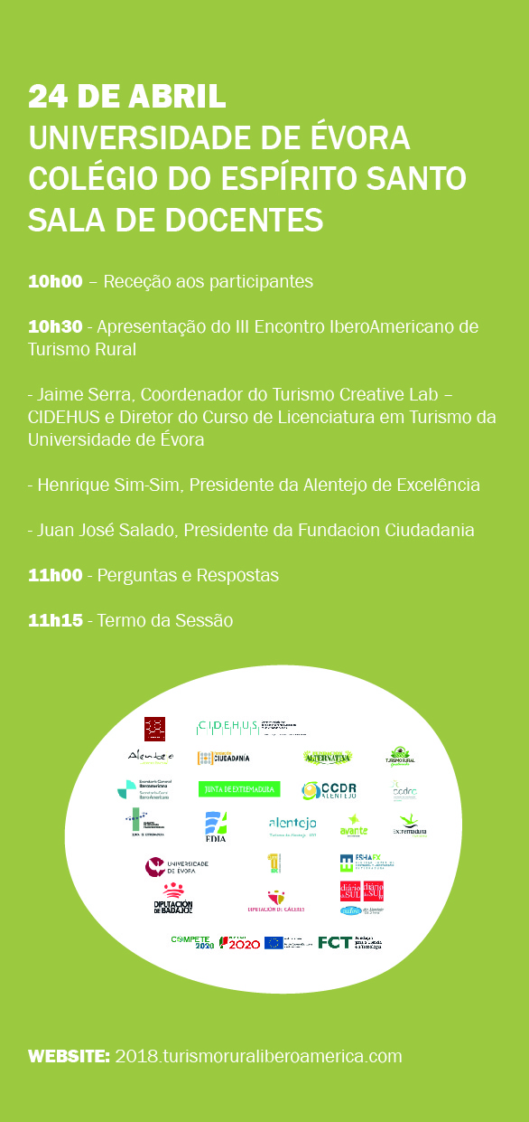 Decorrerá, na Universidade de Évora, no dia 24 de abril, uma sessão pública de apresentação do III Encontro Ibero-Americano de Turismo Rural.